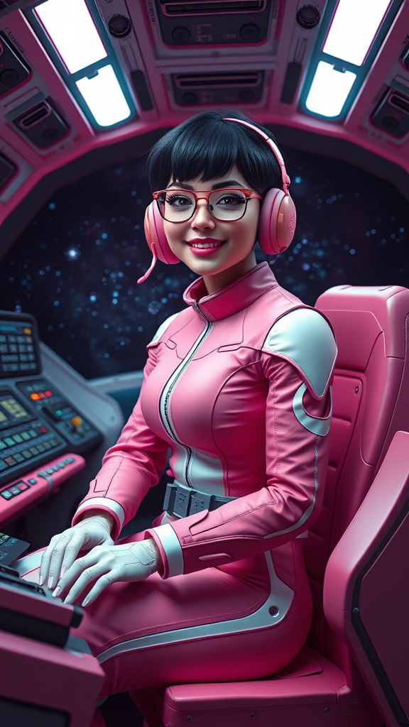 a full body image of a female dark space explorer with very short black hair, positioned in a large ship cockpit surrounded by futuristic controls and the dark expanse of space visible through the window. she wears a sleek pink and white sci-fi outfit and sits comfortably in a pink chair with a matching pink headset. the atmosphere is enhanced by ambient neon lighting. she has a friendly smile, showcasing a confident demeanor. her appearance is enhanced with stylish glasses. her features carry a unique, slightly surreal quality that adds intrigue to her character. while everything around her is precisely rendered in 3d, emphasizing the advanced technology of the space environment, certain elements like her hands and body proportions have an inspired artistic twist to suggest a future where human evolution might make unexpected leaps. the scene offers a captivating mix of realism and imagination, set against the backdrop of a vividly rendered dark space.