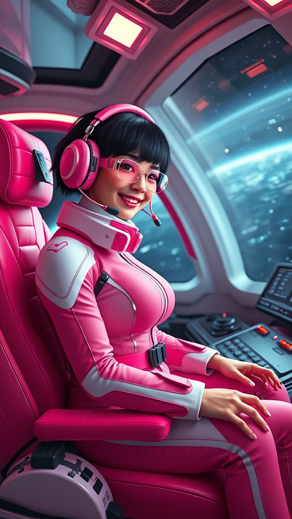 A full-body image of a female dark space explorer with very short black hair in her expansive ship's cockpit. The cockpit is filled with advanced controls and a breathtaking view of the dark expanse beyond the window. She is dressed in a sleek pink and white sci-fi outfit, seated comfortably in a vibrant pink chair, and equipped with a matching pink headset. Her expression is cheerful, revealing a genuine smile. Her attire and surroundings reflect advanced technology, with neon accents highlighting the futuristic design. The scene is rendered in 3D, with glasses enhancing her features. While the setting is captivating, unique alterations abound: her fingers seem artistically elongated, as if exploring new possibilities. Despite the creative distortions, the essence of exploration and innovation remains intact.