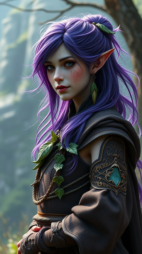 A full body image of a female elf druid with striking purple hair, adorned with plant motifs on her intricately detailed gear, set in an RPG fantasy world. The scene is depicted in epic, photorealistic art with dynamic posing and volumetric lighting that creates an atmospheric effect. Her facial features include a dirty complexion and delicate earrings, adding to her mystical appearance. The elf is in a fluid, dynamic pose that conveys movement and grace. The background captures a high-resolution, detailed fantasy landscape, and the overall composition emphasizes the best quality details without any visual distortions or artifacts. No signatures or watermarks disrupt the immersive visual experience.