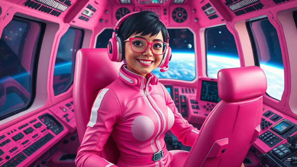 A full body image of a female space explorer with very short black hair inside the large cockpit of her spaceship, vibrant with numerous controls and the vastness of dark space visible through the window. She is wearing a sleek pink and white sci-fi outfit and is smiling confidently. Her pink headset matches her pink chair, adding a cohesive touch to her gear. The setting is rendered in 3D, with lighting accentuating her features as she wears stylish glasses. The design captures a futuristic and neon aesthetic, focusing on her natural proportions and graceful presence.