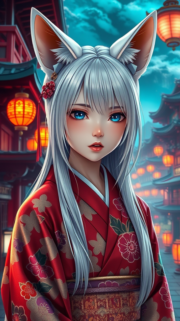 A full-body image of a girl in a hyperdetailed kimono with fox ears, showcasing a perfect face with long, white hair parted in the middle. Her expression is anxious yet graceful, set against a vibrant, intricately designed medieval Japanese cityscape. The scene is filled with vivid colors, capturing an elegant and glamorous atmosphere. The high-resolution image features cinematic lighting and special effects, reminiscent of an UHD, HDR photograph produced with professional studio lighting and hd octane render. This captivating artwork, trending on artstation, embodies a harmonious blend of tradition and fantasy.