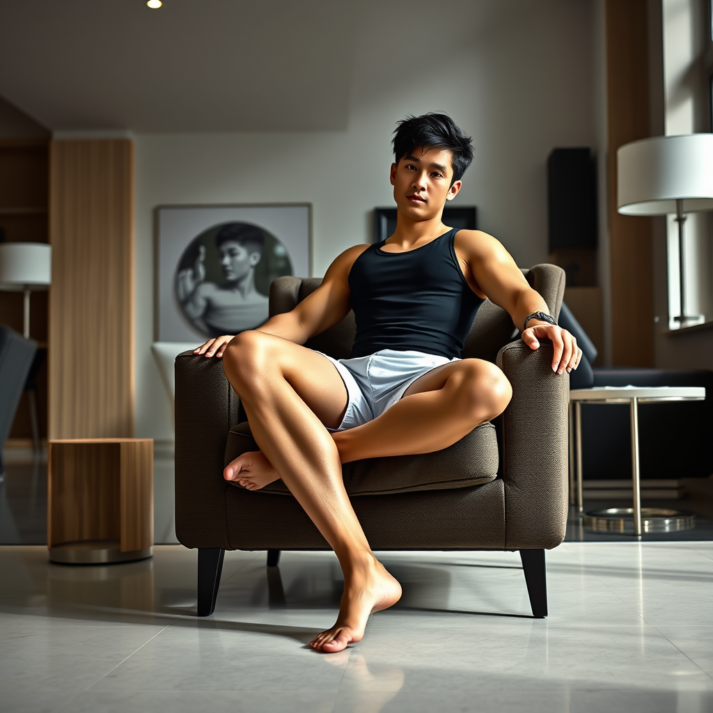 A full-body image of a tall, youthful Korean bodybuilder in a sleek black stringer tank top and snug white shorts, lounging casually in a sophisticated modern home. His muscular and vascular legs are elegantly crossed as he relaxes barefoot in a luxurious, contemporary armchair. The setting radiates a blend of comfort and style, reminiscent of the bold, graphic artistry of Touko Valio Laaksonen.