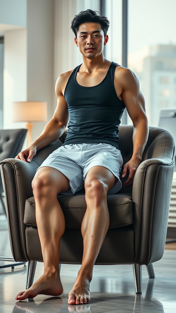 A full-body image of a tall, youthful Korean man with a bodybuilder physique, clad in a sleek black stringer tank top and crisp white short shorts, reclined comfortably in a plush, contemporary chair in a stylish, modern living space, with bare feet and prominently muscular, veiny legs, portrayed in the art style reminiscent of Touko Valio Laaksonen.