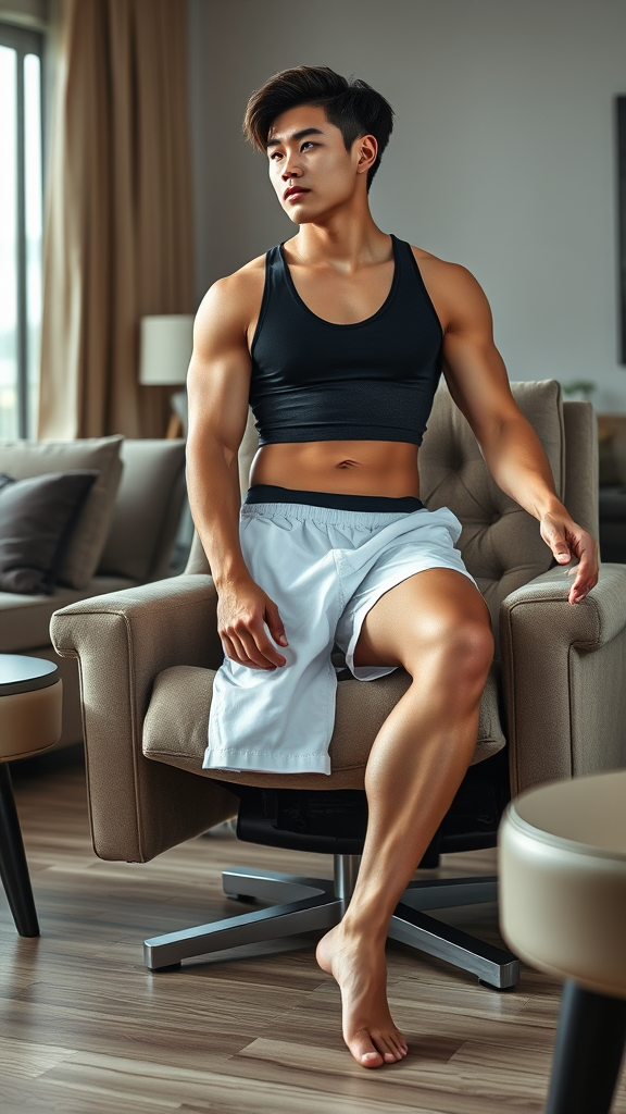 A full-body image of a youthful Korean man with a tall, bodybuilder physique, donning a sleek black stringer tank top paired with crisp white short shorts. He is relaxing in a contemporary home, comfortably settled into a plush recliner, barefoot, showcasing his muscular and vascular legs. The scene is infused with the artistic flair and distinctive style reminiscent of Touko Valio Laaksonen, blending strength and aesthetic in a modern setting.