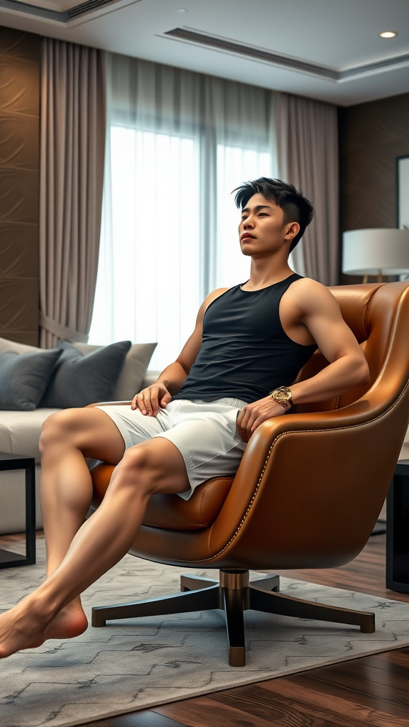 A full-body image of an athletic, youthful Korean man with a tall, muscular build, dressed in a sleek black stringer tank top, paired with snug white shorts. He is relaxed, reclined in an opulent lounge chair within a contemporary living space, his bare feet stretched out, showcasing his muscular and vascular legs. The style is reminiscent of Touko Valio Laaksonen's artistry, with a focus on dynamic form and striking contrasts.