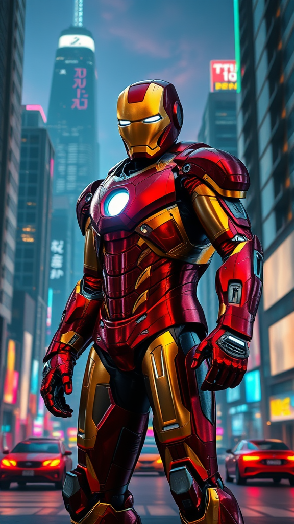 A full-body Iron Man character stands poised in a dynamic pose against the backdrop of a futuristic cyberpunk city at night, where towering skyscrapers bathe the landscape in a sea of neon hues. The scene is captured in ultra-detailed, 8k sharp focus, emphasizing a stunning photorealistic luxury armored suit with intricate chrome details in vibrant shades of red, blue, and gold. The suit reflects the kaleidoscope of fluorescent lights, highlighting its advanced design with a high-tech, intricate pattern that suggests unmatched power and elegance. The city behind is alive with activity, featuring flying cars and holographic advertisements, enhancing the atmosphere with a sense of futuristic energy and innovation.