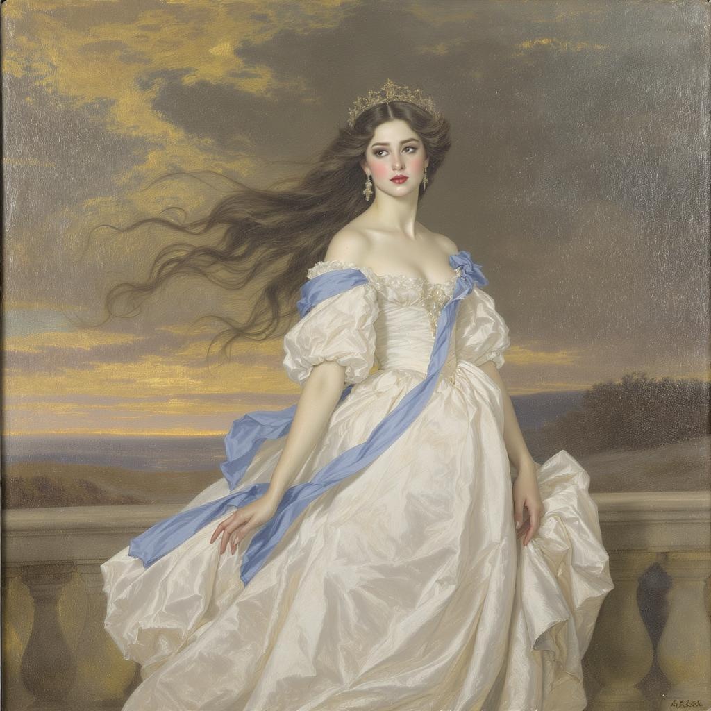 A full-body oil painting portrait of Queen Aprilia, her long hair flowing in the wind, adorned with a blue ribbon on her shoulder. She is elegantly dressed in a white gown featuring puffy sleeves and a graceful sash. The painting blends the romantic realism of Jean-Léon Gérôme with the expressive brushstrokes of John Singer Sargent, capturing an aura of regal poise and ethereal beauty. The background is a softly blurred landscape, enhancing the timeless elegance and grandeur of the scene.