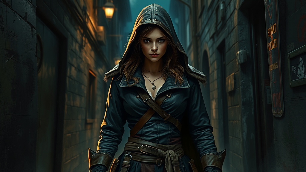 A full-body painting of a striking medieval female thief, rugged and determined, stands amidst a dark, filthy alley at night. Her tattered coat reflects her gritty environment, a stark contrast to her fierce expression. The scene is beautifully rendered in a professional majestic oil painting style, inspired by masters like Ed Blinkey, Atey Ghailan, Jeremy Mann, Greg Manchess, and Antonio Moro, reminiscent of Studio Ghibli's charm. The artwork, trending on ArtStation and CGSociety, showcases intricate details and sharp focus, creating a dramatic, photorealistic effect. Subtle, creative elements add depth, blending influences from midjourney and Greg Rutkowski, alongside a cartoonish touch. It's a vivid fusion of traditional and digital artistry, capturing the raw essence of its subject amidst a complex, immersive background.