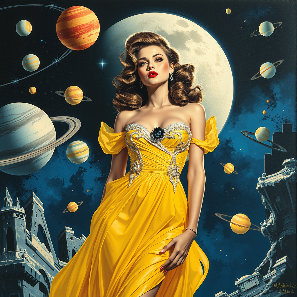 A full-body painting of a woman in a radiant yellow dress, reminiscent of heavy metal comic cover art infused with a space theme. The scene features a pin-up girl in shimmering silver and yellow attire, styled in lunar-themed fashion. Surrounding her, planets appear as whimsical candy confections. Drawing inspiration from the golden age illustrator Joyce Ballantyne Brand, the artwork employs a vibrant blue and black color scheme with striking typography elements, evoking a sense of cosmic wonder and artistic nostalgia.