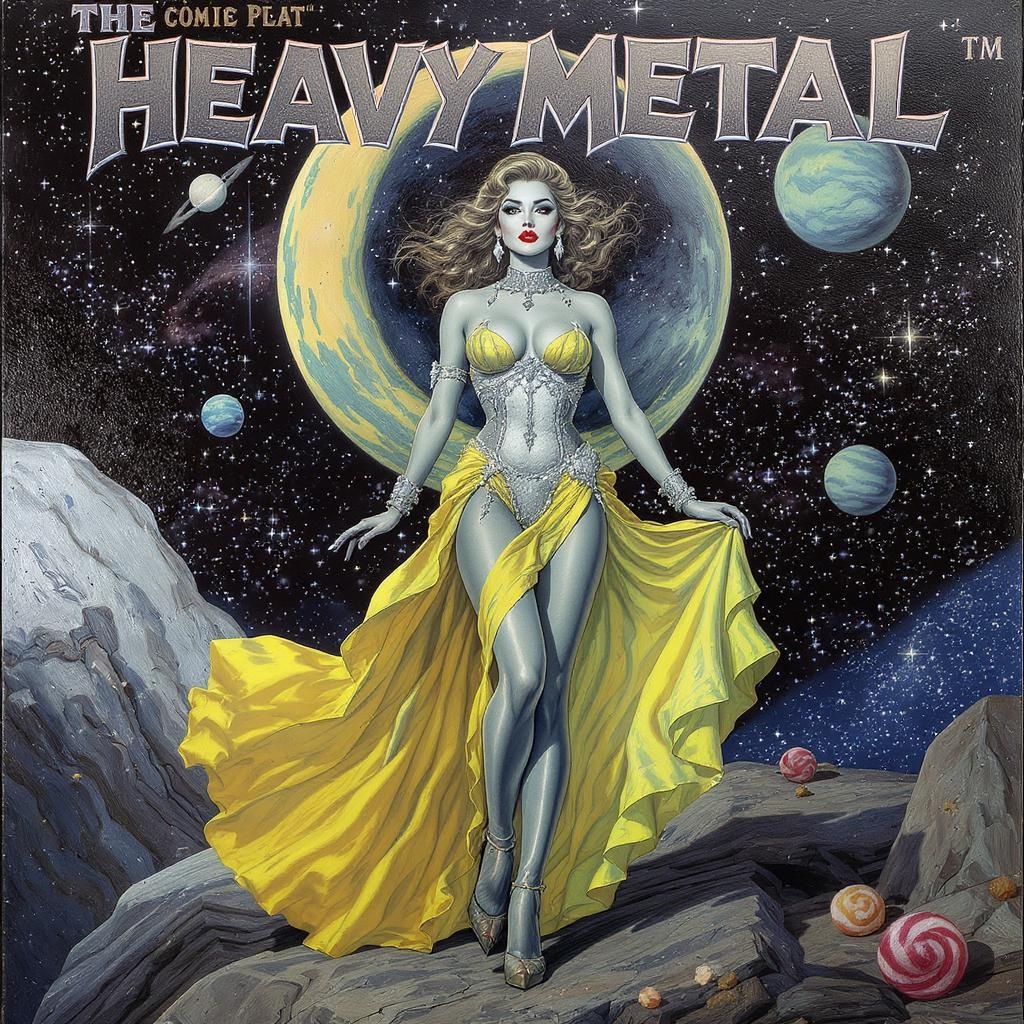 A full-body painting of a woman in a yellow dress combining heavy metal comic cover art with a space theme, featuring a pin-up girl style. The color scheme of silver and yellow highlights her lunar-themed attire, drawing inspiration from golden age illustrator Joyce Ballantyne Brand. The cosmic backdrop has planets that resemble candy, with an overarching blue and black color scheme. Typography in the design reflects vintage styles, emphasizing the ethereal and adventurous essence of the scene.