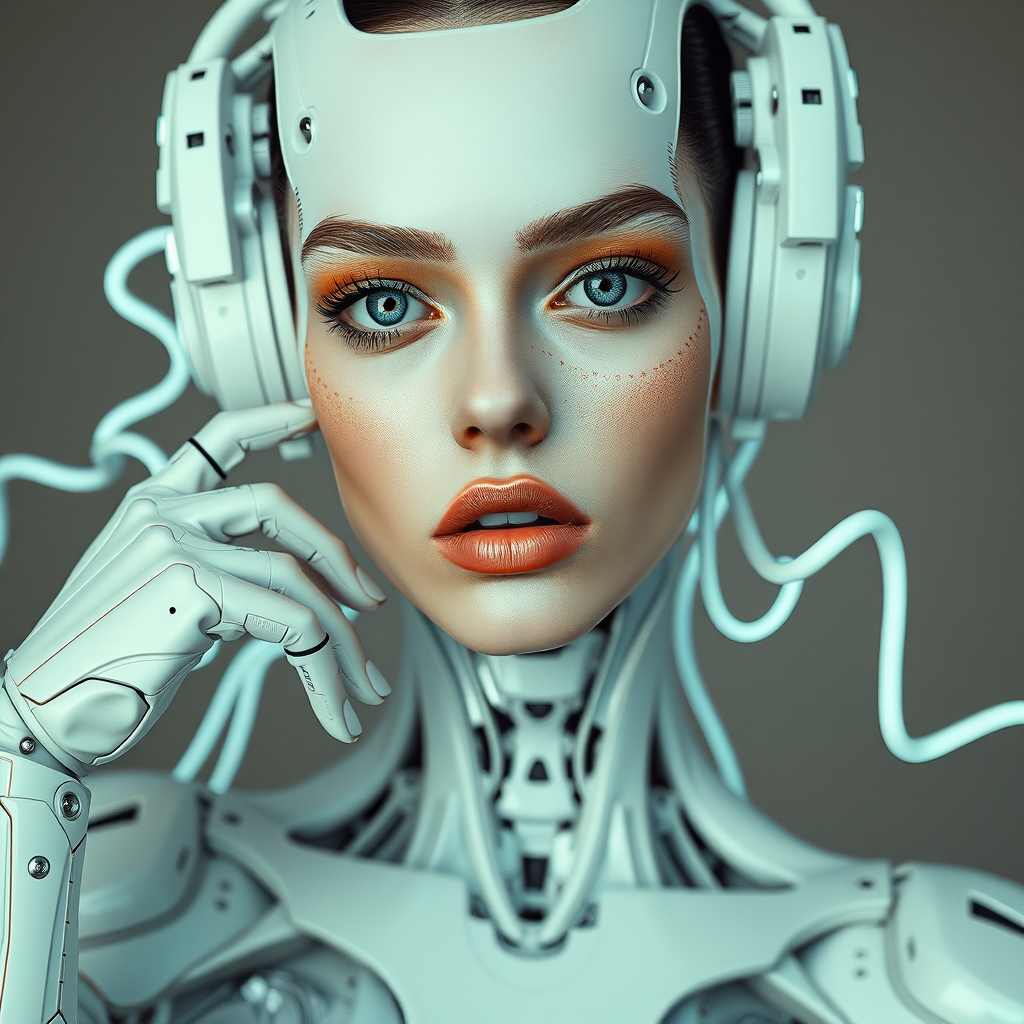 A full body photo featuring a stunning model in a super realistic DMT-inspired fashion photoshoot. The scene exudes a white DMT-themed abstract digital art vibe, highlighted by bold pop art elements and vray tracing intricacies. Zigzag patterns weave through the elegant and emotive poses, adding dynamic flair. The model's expression captures robotic expressionism with eyes wide open, reflecting a fusion of organic and mechanical artistry. The image embodies a vivid exploration of the boundaries between human and machine, blending high-fashion aesthetics with a touch of futuristic surrealism.