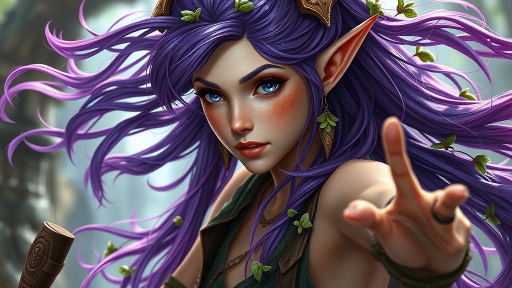 A full body photo of a dynamic female elf druid with flowing purple hair, adorned with plants woven into her gear, set in a fantasy RPG universe. The art is epic and highly detailed, capturing intricate textures and photorealism. Volumetric lighting and atmosphere highlight her in high resolution, showcasing the best quality. She strikes a dynamic pose, showcasing delicate earrings and a slightly dirty face to emphasize her adventurous spirit. Features include a distinct nose and a long neck, all presented in a clear and focused view, avoiding any cropping, low resolution, text, jpeg artifacts, or signatures. The scene contains no watermarks, usernames, or titles, ensuring a pure and immersive fantasy experience.