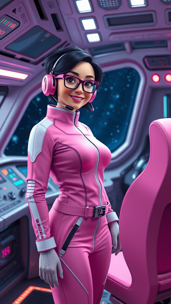 A full body photo of a female dark space explorer with very short black hair standing in her spacious ship cockpit, surrounded by intricate controls, with the vastness of dark space visible through the window. She wears a sleek pink and white sci-fi outfit, complemented by a stylish pink chair and matching headset. Her expression is warm and inviting as she smiles, showcasing a hint of adventurous spirit. The scene is rendered in 3D, featuring subtle neon accents that highlight the futuristic atmosphere. She sports modern glasses, and her hair has a slight curl, adding a touch of flair to her look. The environment is filled with technological details, emphasizing the advanced nature of her ship.