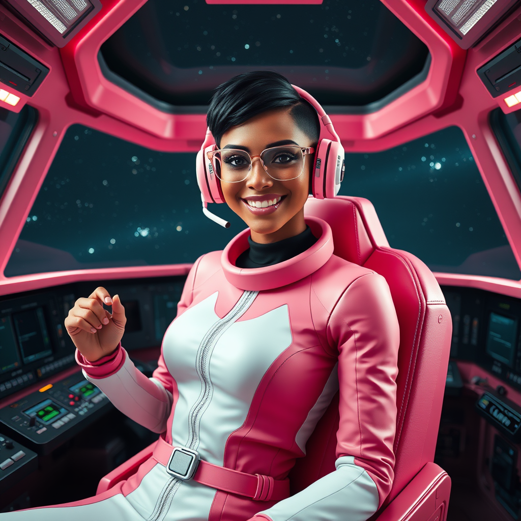 A full body photo of a female dark space explorer with very short black hair, positioned in her large spaceship cockpit. She is surrounded by intricate cockpit controls and a vast expanse of dark space is visible through the window. She is wearing a sleek pink and white sci-fi outfit and is sitting in a distinctive pink chair, adorned with a matching pink headset. The scene conveys an advanced 3D render feel, with realistic details emphasizing her smile and clear glasses. The space explorer has an athletic build, highlighted by her stylish attire. The atmosphere is illuminated by subtle neon accents from the cockpit panels, adding a futuristic vibe. Her hands are skillfully manipulating the controls, reflecting her proficiency and expertise, without any anomalies. The focus remains on her expressive, confident features showcasing her readiness for space exploration. No distractions such as watermarks or irrelevant elements are present, ensuring a clean and captivating depiction.