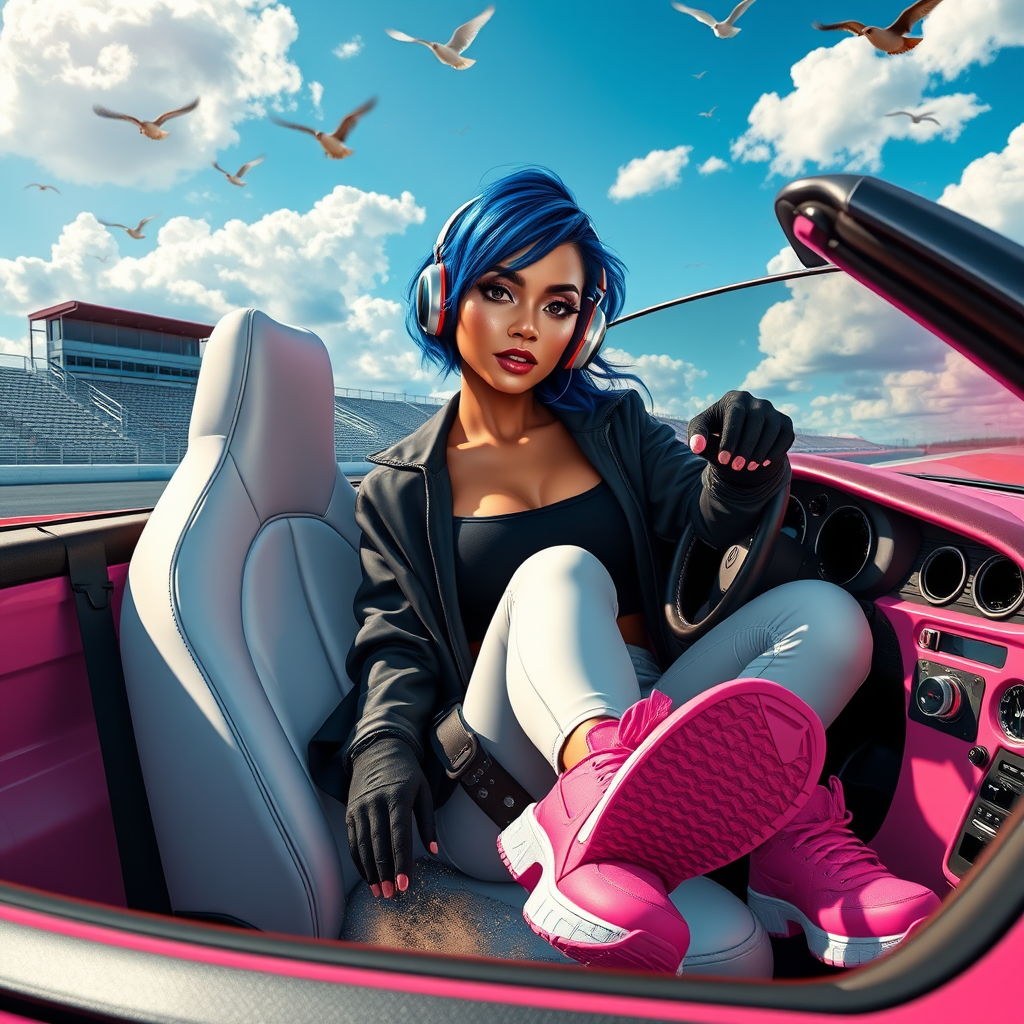 A full body photo of a stunning woman with tanned skin and high cheekbones, sitting confidently in the driver’s seat of a convertible with sleek white seats. She has reflective eyes, dark eyebrows, and expertly applied makeup, wearing racing gloves that suggest her passion for speed. Dust particles catch the detailed lighting that includes rim and dramatic chiaroscuro effects, highlighting her black crop top and open jacket. She pairs these with form-fitting white yoga pants and striking large pink sneakers on a race track with bleachers visible. The sky is a vivid blue with fluffy white clouds and birds soaring above. The scene channels artistic influences from John Constable, Ed Blinkey, Atey Ghailan, mixed with the whimsical touch of Studio Ghibli and the painterly styles of Jeremy Mann, Greg Manchess, and Antonio Moro, making it a trending piece on ArtStation and CGSociety. The woman's distinct blue hair, reminiscent of anime aesthetics, and headphones signal a modern and vibrant character. She drives a captivating pink car, depicted in a vibrant and dynamic canvas-like 3D cartoon with vivid colors.
