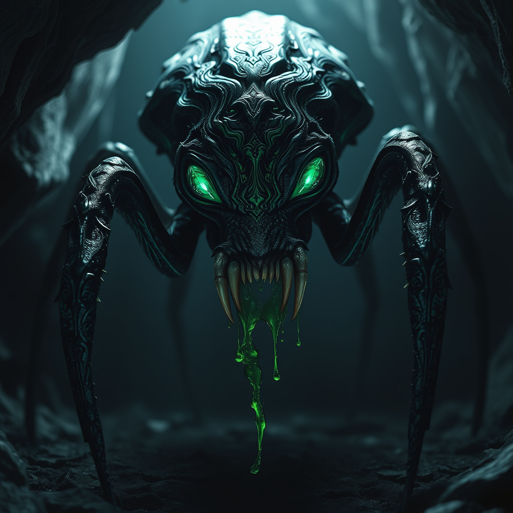 A full body photo of a terrifying extraterrestrial entity resembling a humanoid spider, with viscous venom dripping from its fanged mouth, crawling out of a shadowy cavern. Its piercing emerald eyes radiate malevolence, set against a background of deep darkness. The creature boasts an intricate and ornate body design, covered with finely detailed textures and patterns. The scene is captured with dramatic lighting that highlights its sinister features, creating a photorealistic and cinematic quality. The atmosphere is enhanced with subtle cinematic noise, all rendered in ultra-high-definition.