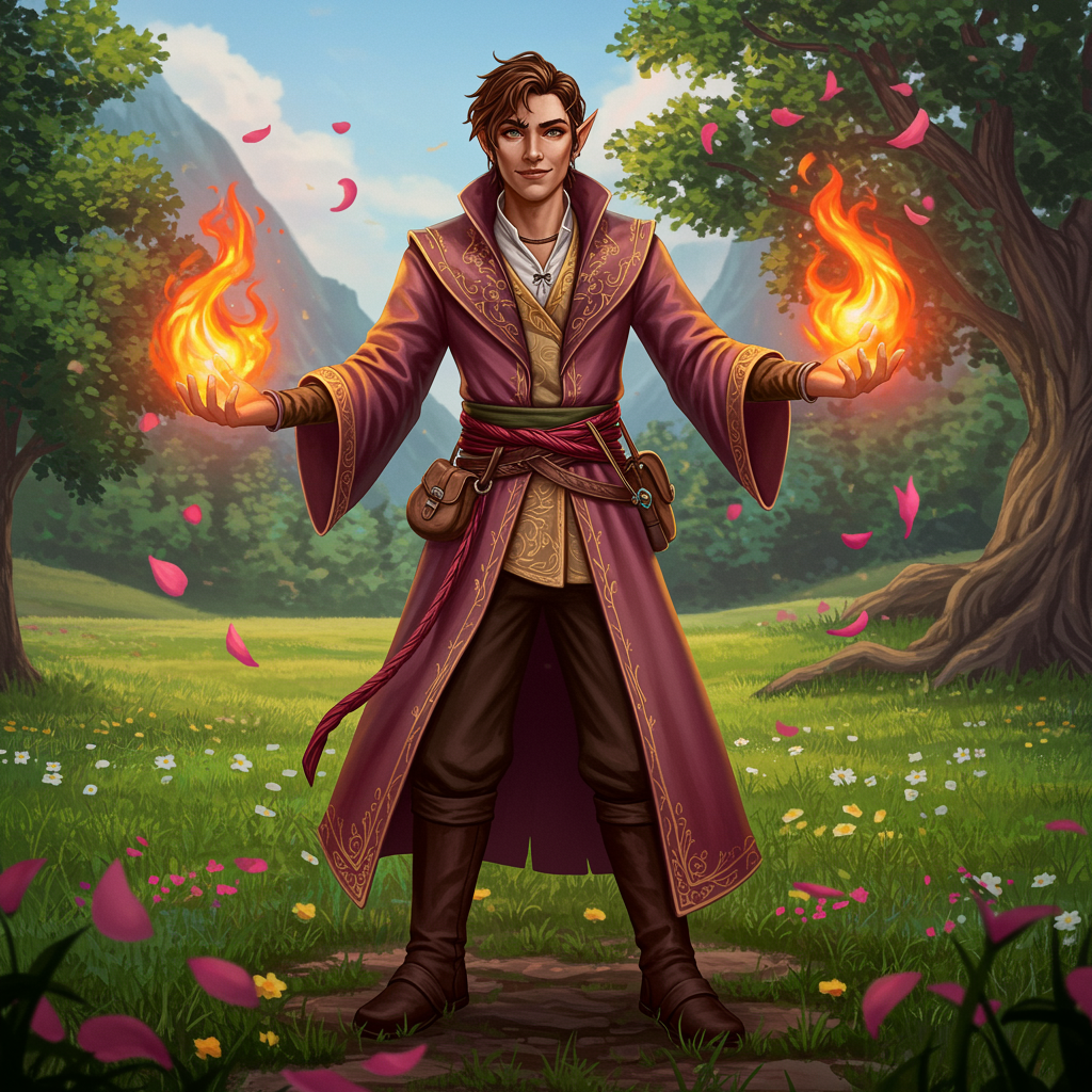 A full-body photo of an exquisitely crafted D&D mage character. The character stands in a vivid countryside setting, dressed in an intricately detailed silk robe, exuding elegance and power. Fire magic swirls around their hands in a spectacle of artistic mastery, reminiscent of works by Ed Blinkey, Atey Ghailan, Jeremy Mann, and Greg Manchess. The scene captures an action pose with dynamic movement, as petals swirl around the mage, emphasizing the dramatic atmosphere. The focus is sharp and the detail high, styled after the sophisticated artistry of Greg Rutkowski and Antonio Moro. The frame is vibrant and animated, blending cartoon and 3D photorealistic elements. The mage's confident expression and pose reflect a harmonious blend of fantasy and realism, with all anatomical features accurately and beautifully depicted.