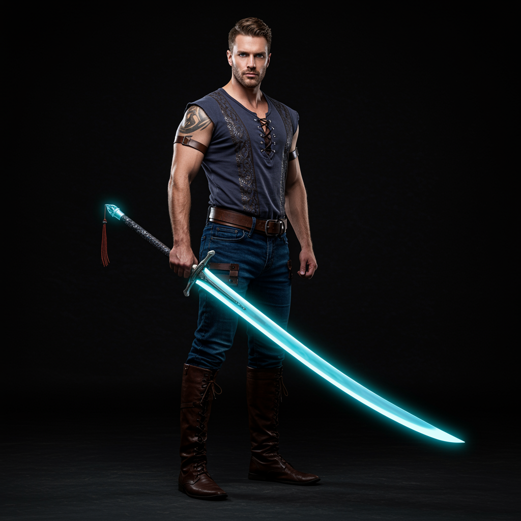 A full body photo shot of a strikingly gorgeous warrior dressed in casual attire with elaborate detailing reminiscent of a seasoned swordsman. He holds a lengthy, gracefully curved sword that emits a mesmerizing bioluminescent glow. This unique and highly detailed 2D masterpiece is presented in ultra-high-definition 8k, capturing every nuance with unparalleled clarity and focus. The warrior stands with perfect anatomy, possessing natural body proportions, and an engaging, confident posture. His keen eyes and expressive features convey both strength and elegance, creating a captivating visual narrative that is perfectly centered and artistically composed.