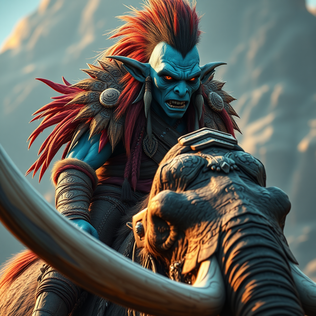 A Full Body photo shot of an azure-skinned native orc warrior, riding atop a magnificent sharp-tusked mammoth, adorned with a captivating visage, vibrant colors, and an air of elegance. This concept art boasts sharp focus, digital artistry, and hyper-realism, with 8K resolution detailing. Utilizing Unreal Engine 5, the image is highly detailed and features dramatic lighting reminiscent of Brom's style, capturing attention on Artstation as a trending piece. The warrior's eyes are hyper-detailed and convey an intense realism, suited for splash art and concept art. Presented in a mid shot with intricate details and rich color depth, the scene is dramatic with a 2/3 face angle. Side lighting casts a colorful background that enhances the overall composition, ensuring high quality without compromising anatomical accuracy or clarity.