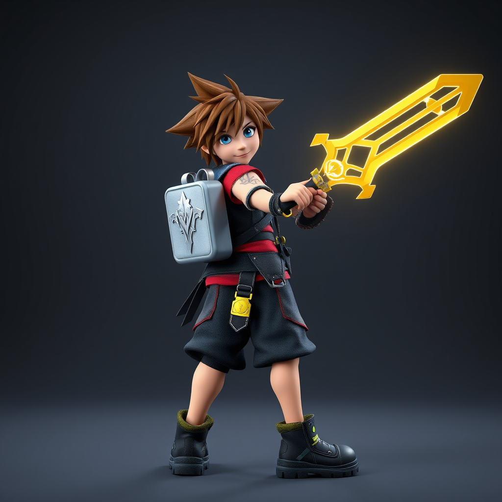 A full body photo shot of the iconic character Sora from Kingdom Hearts, wearing his signature adventurous attire, complete with a backpack marked by a silver crown. He's captured in a dynamic stance, brandishing his well-known golden bioluminescent keyblade, set against the backdrop of a professional photoshoot studio. Created with 3D Studio Max and V-Ray for high-quality, detailed, and accurate representation, inspired by Stanley Artgerm Lau. The scene features realistic materials and precise dimensions, exuding a professional and award-winning aesthetic. Small creative tweaks enhance the imagery while preserving Sora's essence.