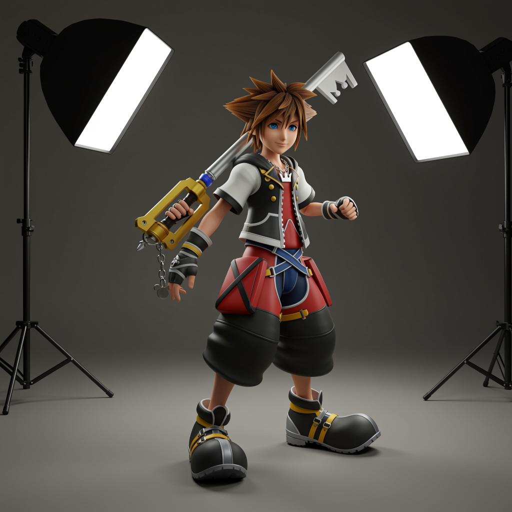 A full body photo shot of the iconic character Sora from Kingdom Hearts, donning his signature adventurous attire, with a backpack featuring a silver crown emblem. He stands dynamically, wielding his renowned golden bioluminescent keyblade, set against the backdrop of a professional photoshoot studio. The scene is a high-quality, detailed, and accurate 3D rendering, created using 3D Studio Max and V-Ray, embodying professional and award-winning standards akin to the artistry of Stanley Artgerm Lau. The rendering showcases realistic materials and precise dimensions. Small creative changes are made, but the core essence remains faithful to the inspiration.