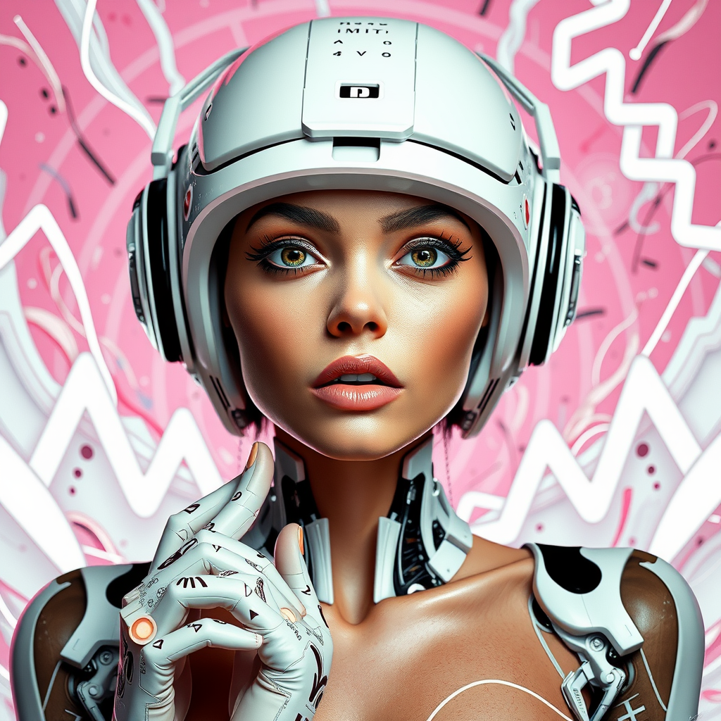 A full body photo showcasing a beautiful model in a super realistic, DMT-inspired fashion photoshoot. The model's eyes are open, surrounded by an abstract digital art backdrop featuring white DMT elements. Bold pop art influences are evident, with vray tracing enhancing the scene. Zigzags and elegant, emotive poses are emphasized, conveying a sense of robotic expressionism. The composition balances these elements while maintaining an air of sophistication and creative flair.