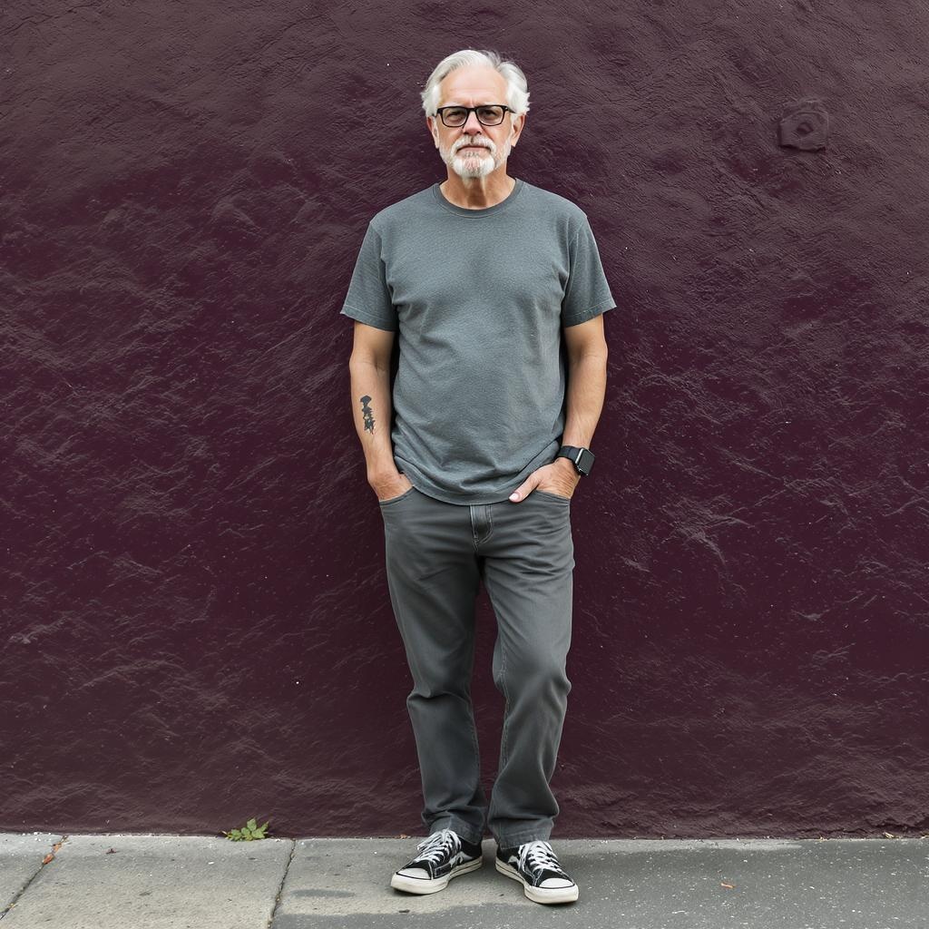 A full-body photograph captures an older male model standing against a rustic, textured, deep plum wall, exuding an aura of wisdom and experience. He wears a monochromatic, slightly fitted, charcoal-gray T-shirt, revealing a subtle minimalist tattoo on his forearm. On his wrist, a sleek black Apple Watch adds a modern touch. His feet are adorned with well-loved black and white low-top sneakers. His silver hair is styled with effortless precision, and he sports stylish black frame glasses that highlight his thoughtful eyes. One hand is casually tucked in his pocket, while his pose exudes aged grace and a contemporary street fashion style. The image is captured in photorealistic detail, emphasizing textures and tones in ultra-high definition. The overall impression is one of confidence and timeless elegance, with nuanced details enriching the portrait.