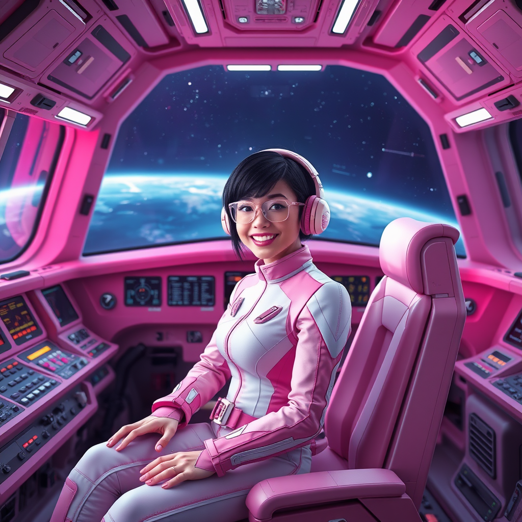 A full body photograph of a female dark space explorer with very short black hair, situated in the cockpit of her expansive spaceship. The cockpit is filled with an array of advanced controls and through the windows, the expanse of dark space is visible. She wears a sleek pink and white sci-fi outfit and is smiling as she sits in a pink chair with a matching pink headset. Her persona is named Emb-Avril. The interior reflects the deep, immersive ambiance of real space. The scene has a futuristic and vibrant feel with slight 3D rendering effects. She wears modern, slightly curved glasses. The overall look is open to a few creative twists, while maintaining a sleek and polished vibe, avoiding any imperfections such as extra limbs or exaggerated physical traits.