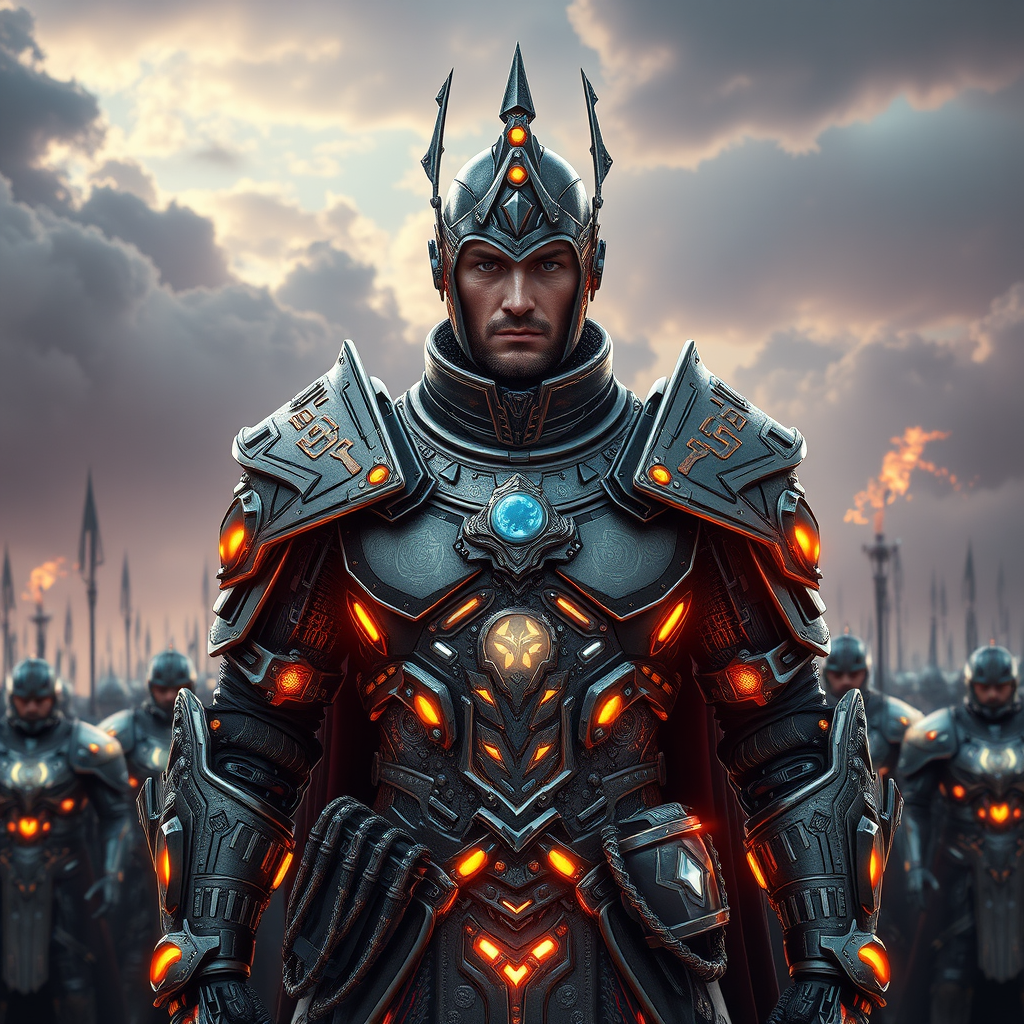A full-body photoshoot of a futuristic necromancer soldier clad in regal armor adorned with intricate cybernetic technology, standing triumphantly at the forefront of an imperial army; the armor is a seamless blend of shimmering holographic elements and rugged dieselpunk aesthetics, inspired by the art of Adam Fisher. The necromancer's expression is one of calm authority, with ethereal energy subtly emanating from their form. Their armor is adorned with glowing runes and advanced circuitry, while a legion of spectral and mechanical warriors stands resolute behind them, all set against a dramatic sky where digital embers mingle with the clouds.