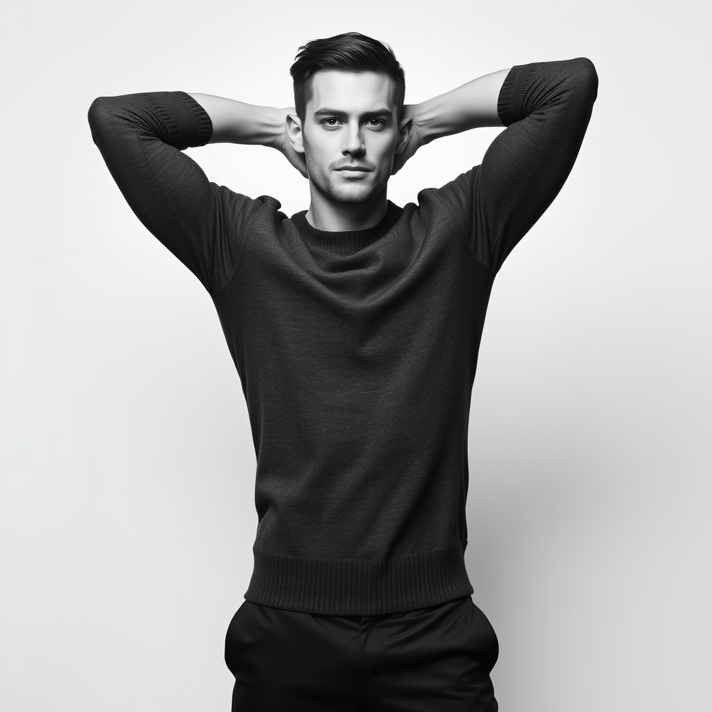 A full-body portrait captures a male model exuding dynamic confidence. He stands tall, his posture strong and assured, with hands interlocked behind his head and elbows extending outward, conveying both relaxation and power. Dressed in a sleek, charcoal gray v-neck sweater paired with matching dark trousers, the ensemble enhances his athletic, lean silhouette. His expression is contemplative and calm, with a subtle furrow in his brow that adds intensity to his gaze. Gentle, directional lighting caresses his features, expertly highlighting the facial structure and the tactile texture of his knitwear. The backdrop is minimalist and unobtrusive, ensuring the model remains the focal point. A black and white filter imbues the image with a classic, timeless quality, sharply defined to capture every nuanced detail, eschewing color for emphasis on form and texture.