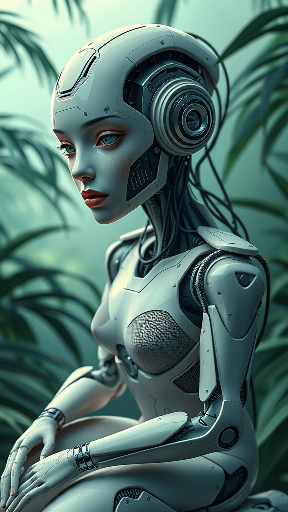 A full body portrait depicting an exquisite porcelain-faced android, showcasing a complex 3D render with robotic elements. The ultra-detailed face displays a blend of cyborg mechanics and harmonious human features, reflecting vibrant details. It captures luxurious cyberpunk motifs with elements of latex, rubber, and lace. An elegant backdrop illuminated with studio soft light and rim lighting frames the android, highlighting its anatomical intricacies and microchip detailing. Cables and electric wires subtly merge with the structure, reminiscent of H. R. Giger's style, while the scene is rendered meticulously in octane, resulting in an 8k hyperrealistic image. The android kneels gracefully, symbolizing a future where consciousness is embedded within robotic forms. The environment hints at a lush jungle or rain forest setting. The portrayal is a masterpiece, rendered with absurdly fine detail, intended as a high-resolution CG unity illustration, invoking a sense of unity and advanced symbiosis between technology and artistry.