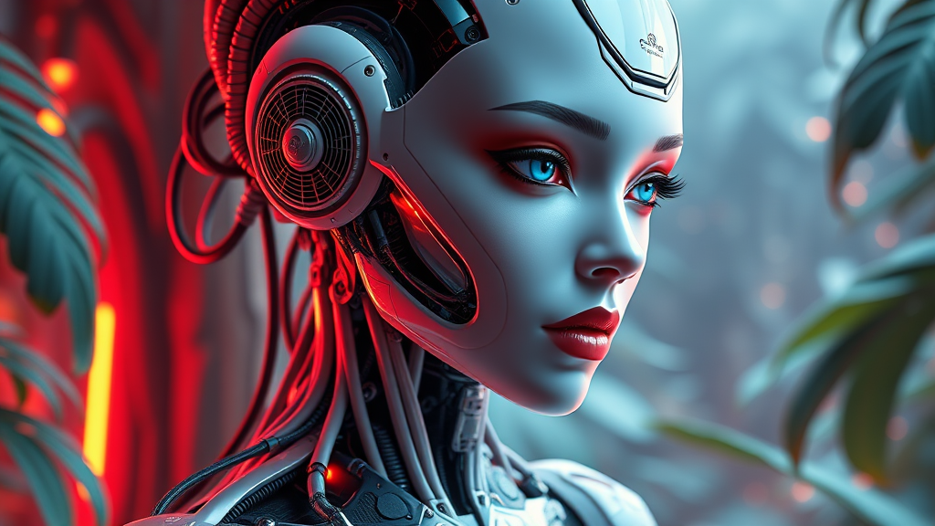 A full-body portrait from head to toes featuring an ultra-detailed, 3D render of a beautiful porcelain-profiled android with cyborg and robotic elements. The design highlights vibrant details under soft studio lighting with rim light accents. Inspired by luxurious cyberpunk aesthetics, the android boasts intricate latex, rubber, and lace textures. The hyperrealistic depiction showcases anatomical features, visible facial muscles, electronic cable wires, and microchips in an elegant composition. Set against a stunning background reminiscent of a futuristic world where consciousness is stored in robotic vessels, the image is rendered in the style of H.R. Giger, achieving exceptional quality at 8K resolution. Captivating and meticulously crafted, it evokes the elegance of Andy M Piatti's artistry, integrated with a jungle rainforest environment. The android is gracefully posed, emphasizing unity within its CG design, offering a rich and immersive visual experience that marries art and technology in a cybernetic masterpiece.