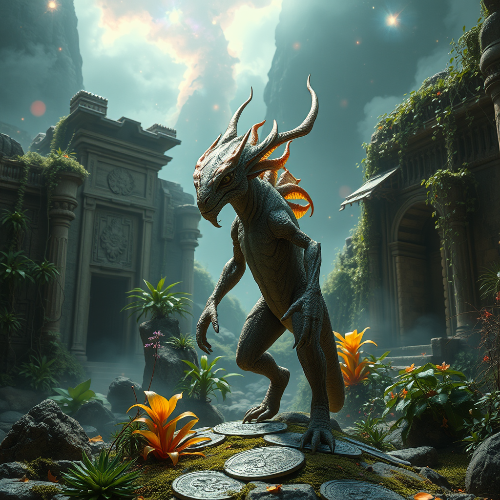 A full body portrait of a captivating fantasy creature set in an enchanting scene, captured in stunning, professional photography. Designed with impeccable attention to detail, the creature stands against a backdrop of a fantasy planet teeming with vibrant life. The scene is brought to life with dynamic, cinematic lighting that highlights the intricacies of ancient, weathered ruins entwined with exotic plants, adding a sense of timeless wonder. Surrounding this mesmerizing vista, colorful nebulas swirl amid a delicate mist, creating a dreamlike atmosphere. Inspired by the works of Jean Ansell, Justin Gerard, and Greg Rutkowski, the composition balances between reality and fantasy, enveloping the viewer in a world where the past and imagination collide.