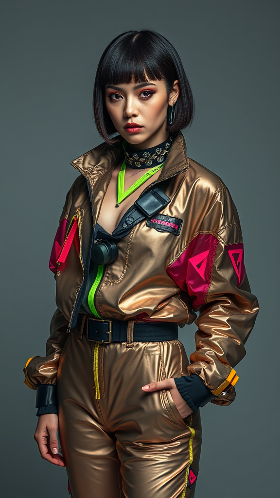 A full-body portrait of a captivating futuristic woman exuding a retro hacker vibe. Her melancholic yet undeniably beautiful expression radiates confidence. She sports an avant-garde outfit that seamlessly blends high-fashion elements with a mix of metallic fabrics and vibrant neon details, complemented by a hint of retro flair through oversized jackets and geometric patterns with cyberpunk nuances. Her physique is fit and well-proportioned, enhancing the striking ensemble. Her hair is a sleek, modern bob, cut just above the shoulders, perfectly accentuating her sophisticated style. The plain gray background subtly highlights her distinctive presence, with gentle lighting casting a soft emphasis on her features and carefully curated outfit, ensuring her unique aura remains the focal point.