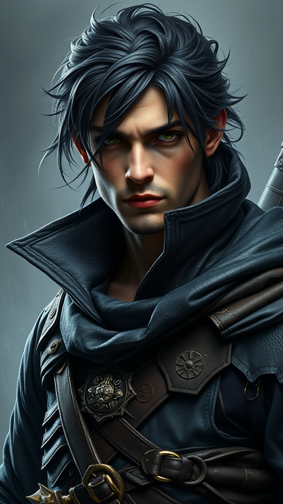 A full-body portrait of a charismatic male rogue with intricate, symmetrical features, set in a fantasy RPG world reminiscent of Dungeons and Dragons. This award-winning, highly detailed masterpiece captures the essence of a cunning adventurer, highlighting his agile build and enigmatic expression. His attire, a blend of dark leather and subtle, ornate embellishments, reflects his stealthy nature while hinting at an adventurous life. The image is rendered in stunning 16k resolution, bringing to life the rogue's sharp gaze and confident stance, embodying the allure and mystery of the archetypal D&D character.
