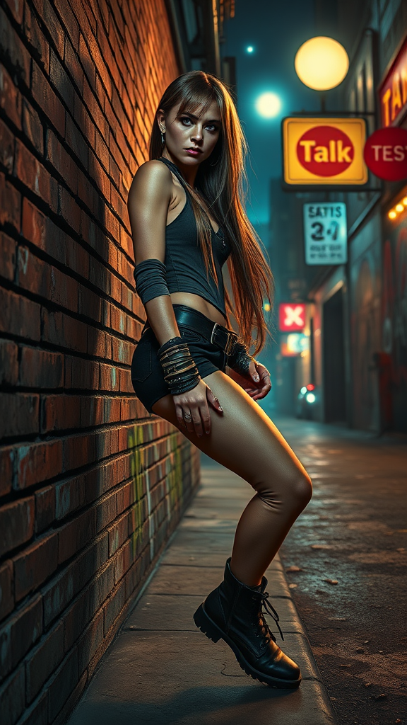 A full body portrait of a cyberpunk woman confidently leaning against a gritty brick wall in a vibrant cyberpunk city street at night, surrounded by the glow of neon city lights and hints of distant stars under a bright moon. She strikes a dynamic pose, exuding an air of rebellious strength. Her long, sleek hair flows down to her shoulders, framing a detailed and symmetrical face with a fierce scowl. This punk-alt girl style is complemented by multiple ear piercings and reflective eyes enhanced with striking makeup. Her attire features long sleeves and numerous bracelets adorning her arms, while worn, muddy boots are tied with black shoelaces. Intricate graffiti decorates the wall, adding to the urban atmosphere. The scene is captured with dramatic, chiaroscuro lighting, creating a sense of depth and intensity. This image is reminiscent of a professional majestic impressionism oil painting, inspired by artists like Waterhouse, John Constable, Ed Blinkey, and Studio Ghibli influences, featuring intricate, high detail, and exquisite artwork trending on ArtStation and CGSociety.