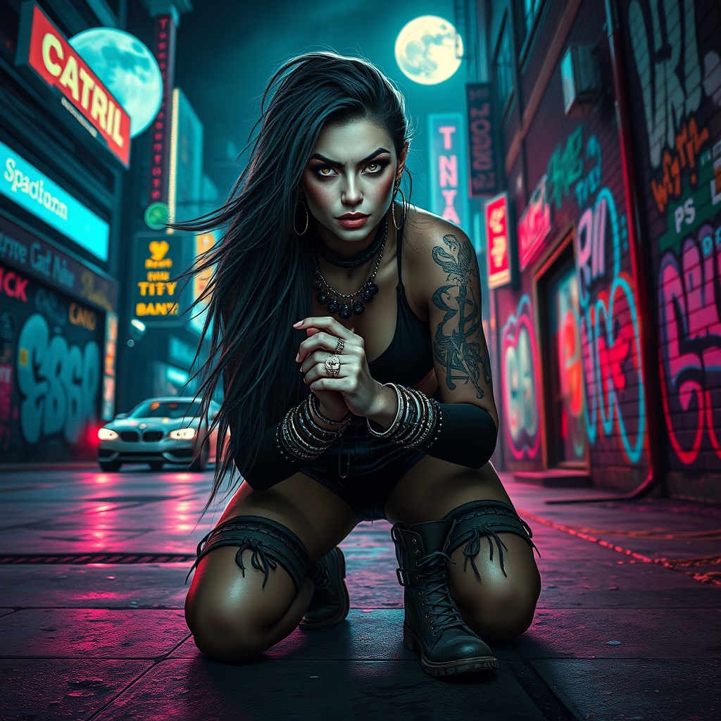 A full body portrait of a cyberpunk woman kneeling on a neon-lit street at night in a futuristic city, surrounded by vibrant city lights and a glowing moon. She displays a fierce scowl, with long hair flowing, her face detailed and symmetrical. Her appearance exudes an alternative punk vibe, adorned with numerous rings, reflective eyes, striking makeup, and multiple ear piercings. The scene is illuminated with dramatic chiaroscuro lighting, enhancing her long sleeves and the bracelets adorning her wrists. The backdrop features a brick wall covered in graffiti, adding to the urban atmosphere, while her muddy boots reveal a gritty edge. The artwork is captured in a professional majestic impressionist style, influenced by artists such as Waterhouse, Constable, and Mann, and shows intricate detail, trending on ArtStation and CGSociety. Her intriguing features include face tattoos, enhanced by the vibrant and dramatic lighting, creating a sense of depth and charisma. The atmosphere is a blend of surreal and realistic elements, resulting in a masterpiece that captures the futuristic essence of a cyberpunk world.