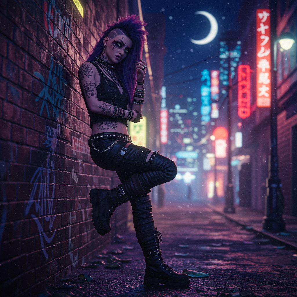 A full body portrait of a cyberpunk woman leaning on a wall in a vibrant cyberpunk city street at night, illuminated by the colorful glow of city lights with a backdrop of stars and a crescent moon. Her long hair and detailed symmetrical face accentuate her edgy demeanor, complete with a scowl and punk-inspired makeup. The outfit consists of long sleeves, numerous bracelets, and muddy boots, adding to her alternative style. She is adorned with many rings and ear piercings, her reflective eyes hinting at a story untold. The dramatic chiaroscuro lighting highlights the intricate details of her face, accented by a face tattoo. The brick wall she's leaning against is covered in graffiti, enhancing the urban setting. This scene is imagined as a professional majestic impressionism oil painting influenced by artists like Waterhouse, John Constable, and inspired by the vision of Studio Ghibli. It's trending on ArtStation and CGSociety, known for its high detail and dramatic visuals reminiscent of Makoto Shinkai's Kyoto. The image is sharp and precisely crafted, steering clear of any visual aberrations like extra limbs or blurry features, maintaining a vivid and captivating portrayal.