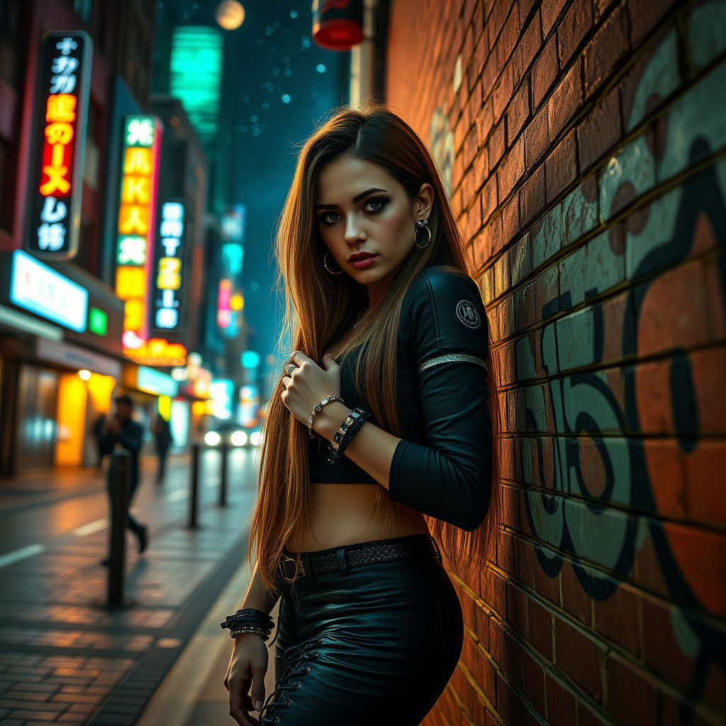 A full-body portrait of a cyberpunk woman standing against a wall in a bustling nighttime city street, vibrant city lights illuminating the scene, with stars and a glowing moon overhead. She is enveloped in colored lighting that highlights her futuristic attire, striking a dynamic pose with a determined expression. Her long hair cascades down, framing a detailed and symmetrical face, adorned with makeup and numerous ear piercings. Her punk-inspired look is accentuated by short hair layers, an ensemble of rings, and a collection of bracelets. Reflective eyes suggest a depth of character. Her attire features long sleeves, leading down to black shoelaces on muddy boots, set against a backdrop of a brick wall adorned with imaginative graffiti. The scene features dramatic rim lighting, creating a chiaroscuro effect. The style blends the majestic impressionism of Waterhouse, John Constable's landscapes, the vision of Ed Blinkey, Atey Ghailan's dynamic artistry, and the immersive feel of Studio Ghibli, with inspirations from Jeremy Mann, Greg Manchess, and Antonio Moro. This intricate and high-detail piece is trending on ArtStation and CGSociety, embodying the dramatic aesthetic of Makoto Shinkai's Kyoto. The painting avoids elements like face tattoos, large bodies of water, canvas frames, cartoonish features, or 3D-like distortions to maintain a natural and grounded realism.