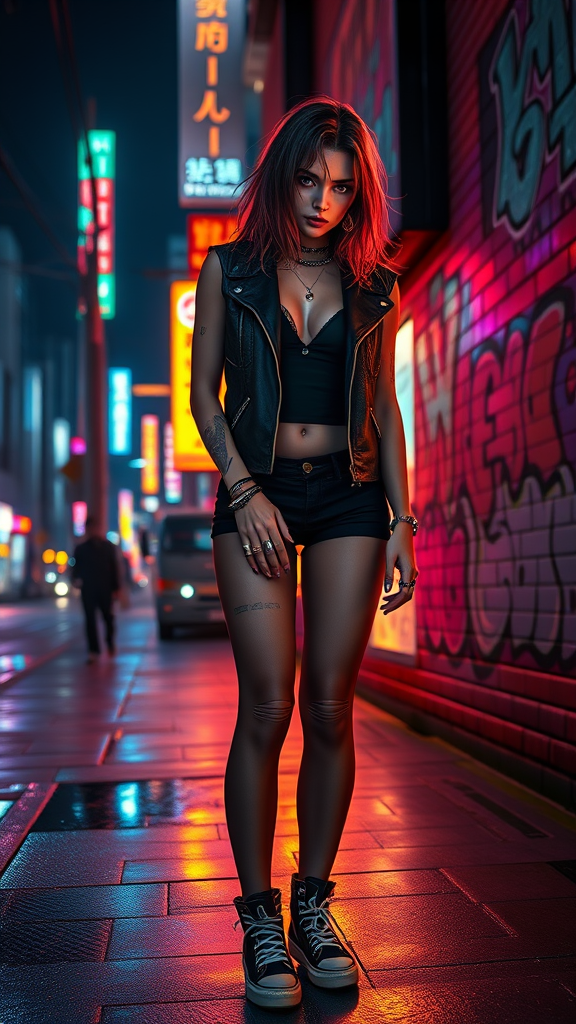 A full body portrait of a cyberpunk woman standing on a neon-lit city street at night, surrounded by vibrant city lights and colored reflections. She stands confidently on the pavement, with a scowl and long, flowing hair framing her detailed symmetrical face, complemented by short punk-inspired elements. Her look is completed with alt style attire, adorned with numerous rings and reflective eyes highlighted by striking makeup. Ear piercings glimmer under the detailed rim and dramatic chiaroscuro lighting. A brick wall behind her features vivid graffiti, adding to the urban atmosphere. The scene exudes a professional majestic impressionism, reminiscent of the works of Waterhouse, John Constable, and the animated storytelling of Studio Ghibli. Artistry inspired by masters like Jeremy Mann, Greg Manchess, and Antonio Moro, this image is trending on ArtStation and CGSociety for its intricate, high-detail style. The setting evokes a sense of makoto shinkai's Kyoto, blending elements of lake and river reflections, crafted on a digital canvas frame.