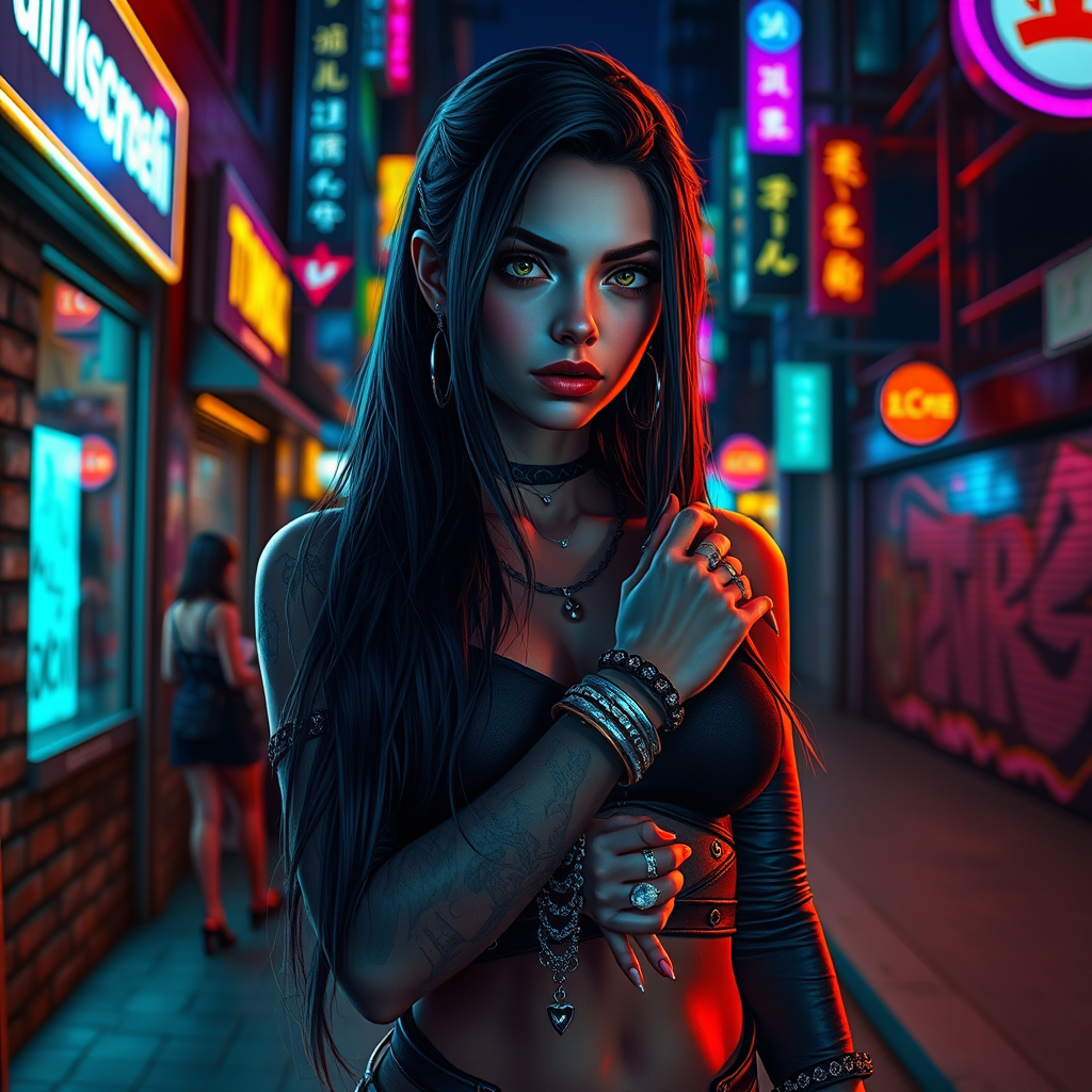 A full body portrait of a cyberpunk woman standing confidently on a bustling cyberpunk city street at night. She's illuminated by vibrant city lights, creating an interplay of colored lighting that enhances her striking presence. Her long hair cascades down her shoulders, framing a detailed, symmetrical face with a subtle scowl that adds to her punk persona. Her attire features long sleeves adorned with various bracelets and many rings, while intricate makeup and ear piercings emphasize her edgy style. Reflective eyes capture the ambient light, hinting at the neon environment. The street setting has a textured brick wall with graffiti in the background, and dramatic rim lighting highlights her form with chiaroscuro effects. This scene is reminiscent of impressionism with a touch of majestic realism, inspired by artists like Waterhouse, John Constable, and others known for high detail and intricate compositions. The atmospheric style is akin to the works of Studio Ghibli and Makoto Shinkai, blending elements that are trending on platforms like ArtStation and CGSociety. The composition captures a sense of movement and depth, with a blend of professional digital and traditional art techniques, ensuring a captivating and dynamic visual.