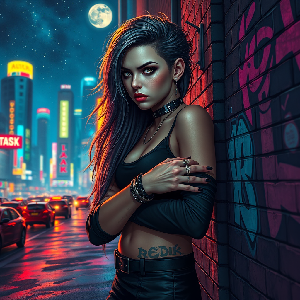 A full body portrait of a cyberpunk woman standing against the wall in a vibrant, futuristic city street at night, surrounded by neon city lights and a shimmering skyline under the stars and moon. She has a defiant scowl, with long, flowing hair framing her detailed, symmetrical face, alongside a side with short hair. The woman embodies a punk and alt aesthetic, adorned with many rings, reflective eyes, and bold makeup. Her ears are heavily pierced, with detailed, dramatic lighting casting a chiaroscuro effect on her figure. Dressed in long sleeves and bracelets, she stands confidently in muddy boots against a brick wall covered with vivid graffiti art. The scene, rendered in a majestic impressionism style reminiscent of masters like Waterhouse and John Constable, carries influences from modern artists such as Ed Blinkey and Atey Ghailan, combined with the signature touches of Studio Ghibli and the dramatic flair of Jeremy Mann. The portrait is trending on platforms like ArtStation and CGSociety, showcasing an intricate, high-detail depiction. In the background, the ambiance of a futuristic city by a lake, ocean, or river adds depth, highlighted by unique, vibrant colors from the mind of a Makoto Shinkai Kyoto vision, ensuring no element overshadows the balance of its details, with no imperfections in anatomy or form.