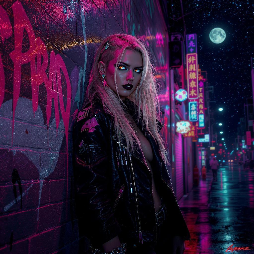 A full body portrait of a cyberpunk woman standing against a wall in a vibrant, neon-lit cyberpunk city street at night. The city is alive with colorful lights that bounce off her long blonde hair and detailed, symmetrical face. She exudes a punk and alt-girl vibe, accentuated by her multiple rings, ear piercings, and reflective eyes all highlighted by dramatic chiaroscuro lighting. Her expression is a scowl, blending with the chaotic beauty of the city's graffiti-covered brick walls. Sheβs dressed in long sleeves, adorned with bracelets, and her stance is dynamic and full of attitude. The scene captures a futuristic ambiance reminiscent of majestic impressionism, influenced by artists like Waterhouse, Constable, and modern masters such as Jeremy Mann and Makoto Shinkai. This intricate and high-detail setting is trending on art platforms like ArtStation and CGSociety, artfully avoiding common pitfalls of bad anatomy or disfigurement. The artwork embodies a unique mix of elegance and urban grit, set against a backdrop of starry skies, the moon, and an endless horizon suggested beyond the bustling streets.