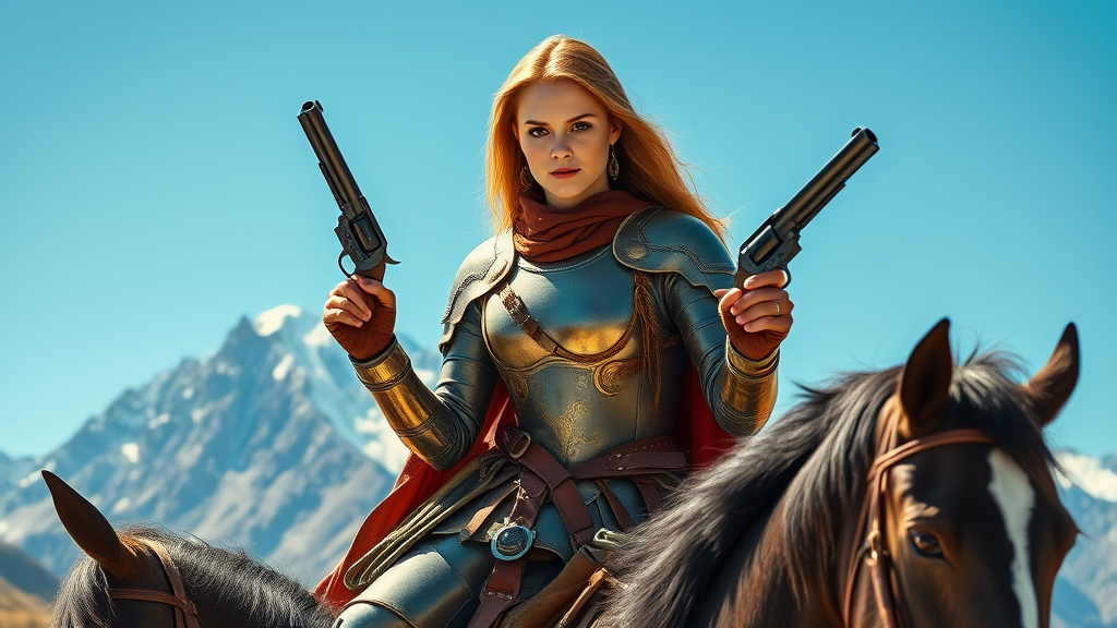 A full-body portrait of a female knight with a cowboy twist, seated confidently atop a majestic horse. She is clad in intricate medieval armor that gleams under the bright blue skies, her eyes sharp and focused. In one hand, she holds a flintlock pistol with a beautifully carved handle, while the other hand steadies a modern-day revolver. Behind her, towering mountains create a dramatic backdrop, their snow-capped peaks intersecting the clear azure sky. The scene exudes hyper-realism, resembling an exquisite oil painting reminiscent of Frank Frazetta's legendary style.