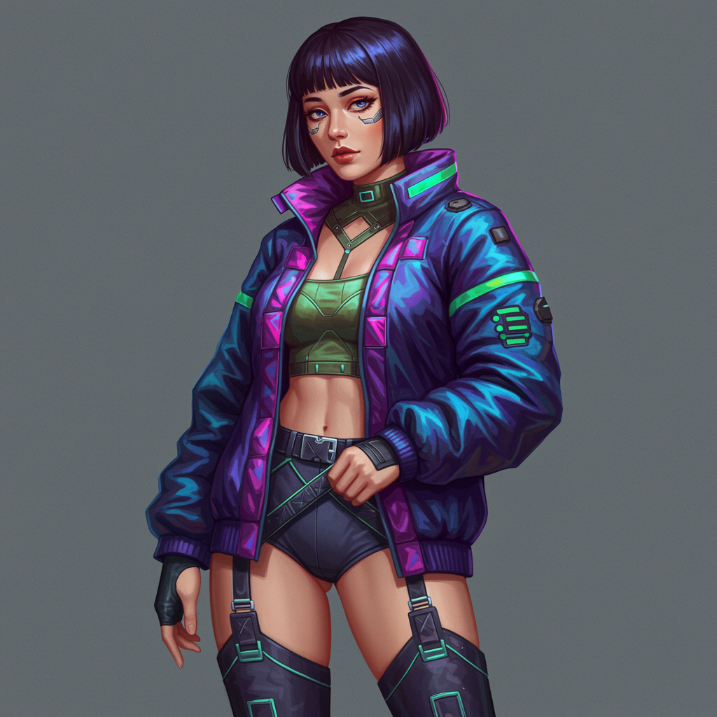 A full-body portrait of a futuristic woman exuding retro hacker vibes; she emanates a melancholic yet captivating presence, beauty intertwined with an undeniable confidence. Her attire is a high-fashion marvel, merging metallic and neon futuristic fabrics with retro-inspired oversized jackets and cyberpunk details, complete with geometric patterns. Her physique is fit and well-proportioned, and her hair is a sleek, modern bob, cut just above the shoulders. Against a plain gray background, her style and aura stand out compellingly. Subtle lighting enhances her features and outfit, creating a balanced and striking visual impression.