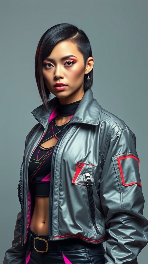 A full-body portrait of a futuristic woman with a retro hacker vibe. Her melancholic yet undeniably beautiful expression exudes confidence. She wears a high-fashion outfit blending futuristic metallic materials and neon accents with retro elements like an oversized jacket, geometric patterns, and cyberpunk-inspired details. Her physique is fit and well-proportioned. Her sleek, straight hair, cut just above the shoulders, adds a modern touch. The plain gray background highlights her distinct style and aura, with subtle lighting accentuating her features and outfit without overpowering the scene.