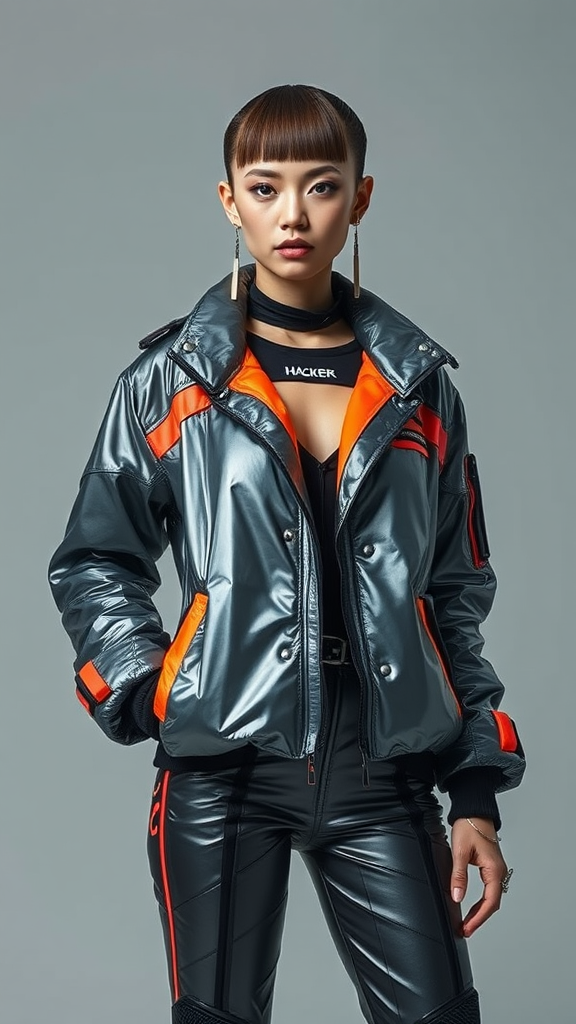 A full-body portrait of a futuristic woman with a retro hacker aesthetic, showcasing a melancholic yet undeniably confident beauty. She is dressed in a high-fashion ensemble, combining futuristic materials like shimmering metallics and neon accents with retro-inspired oversized jackets, bold geometric patterns, and cyberpunk details. Her fit, well-proportioned physique complements her striking outfit. Her short, straight hair, styled just above the shoulders, exudes a sleek modern feel. Set against a plain gray background, the subtle lighting highlights her features and attire, accentuating her unique style and presence.