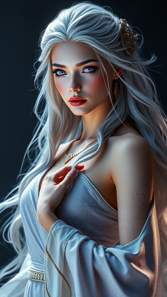 A full body portrait of a game character embodying an eternal goddess, featuring intricately detailed amethyst eyes. Captured using the Hasselblad H4D 200MS Digital Camera paired with a Mitakon Speedmaster 65mm f/1.4 XCD lens, utilizing Fresnel lighting to highlight her ethereal presence. The goddess is adorned in flowing garments that shimmer with celestial patterns, her hair cascading in a cascade of silver waves. Her skin has a luminescent glow, and subtle cosmic motifs sprawl across her arms, suggesting not only beauty but power. She stands in a serene yet commanding pose, hinting at an ancient wisdom that transcends time. The composition portrays an otherworldly atmosphere, blending the divine with the imaginative nuances of a fantasy realm.