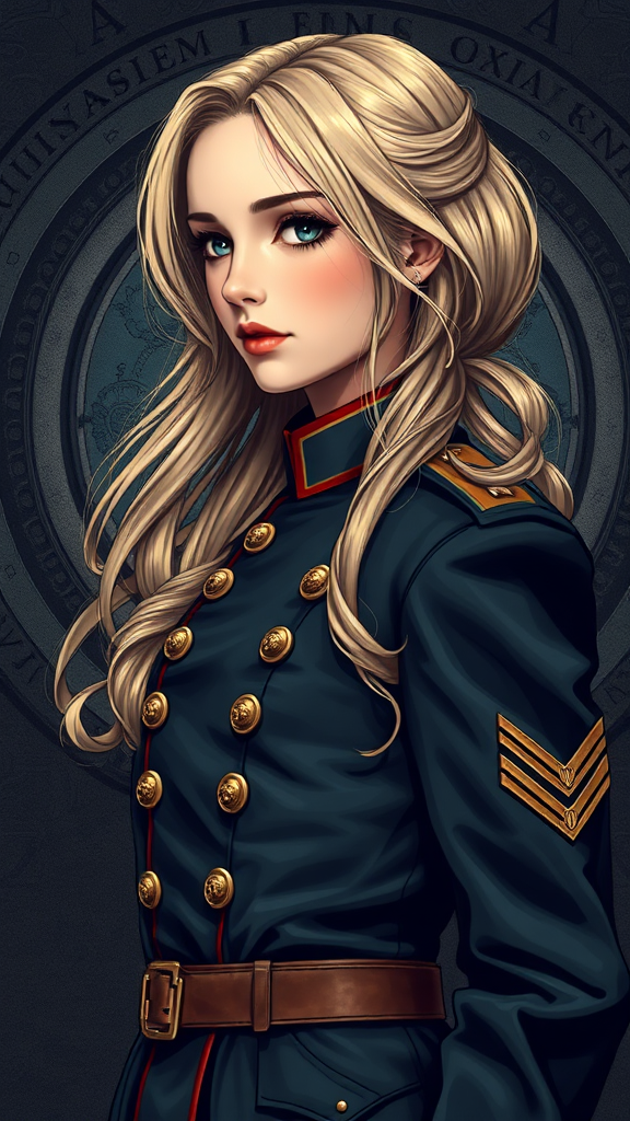 A full-body portrait of a girl dressed in an officer's ceremonial tunic, her loose blond hair cascading around a model-like face, crafted in a dieselpunk style blending elements of both the Russian and British empires. The setting is richly detailed, with intricate monograms and cogs forming a dynamic background, evoking a sense of retro futurism. The art style is reminiscent of Ian McQue's work, offering a highly realistic, anime-influenced depiction with maximum detailing. The color palette is composed of dark shades, providing a vintage yet sophisticated atmosphere. The illustration is an intricate and detailed side view, capturing the aristocratic essence and 8k realism in a vintage, retro-futuristic style.