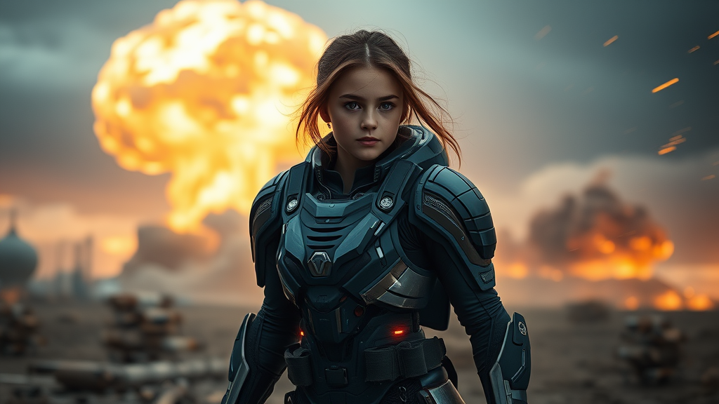 A full-body portrait of a girl in an advanced exo suit with sci-fi armor, set against the dramatic backdrop of a nuclear explosion. The scene captures the intense blast wave and swirling nuclear ash, embodying the energy of atomic fission. The setting is incredibly detailed, offering a cinematic and futuristic style. The image is rendered in stunning 8K UHD, with a focus on super-detailed photorealism and hyper-realism. A flash of light suggests acceleration and speed, as if painted in a third-person view with long exposure. The scene is characterized by complex lighting and cinematic staging, evoking the feel of a high-budget movie still in a science fiction universe.